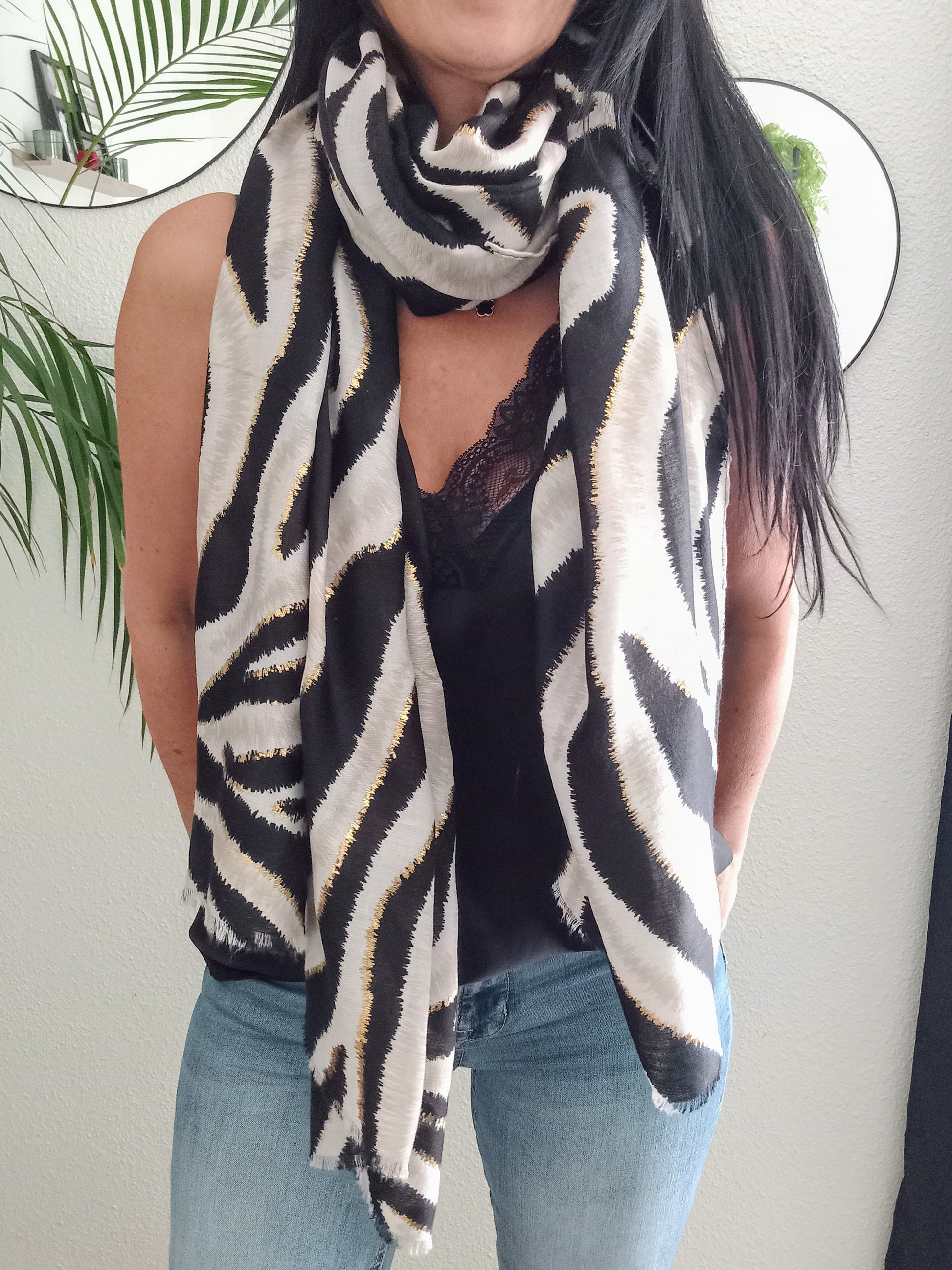 Découvrez notre Foulard imprimé zèbre en coton et viscose, dans une teinte noir élégante rehaussée d'un liseré doré. Ajoutez une touche de style sauvage à vos tenues avec cet imprimé tendance. Ce foulard vous apportera confort et élégance pour toutes occasions.